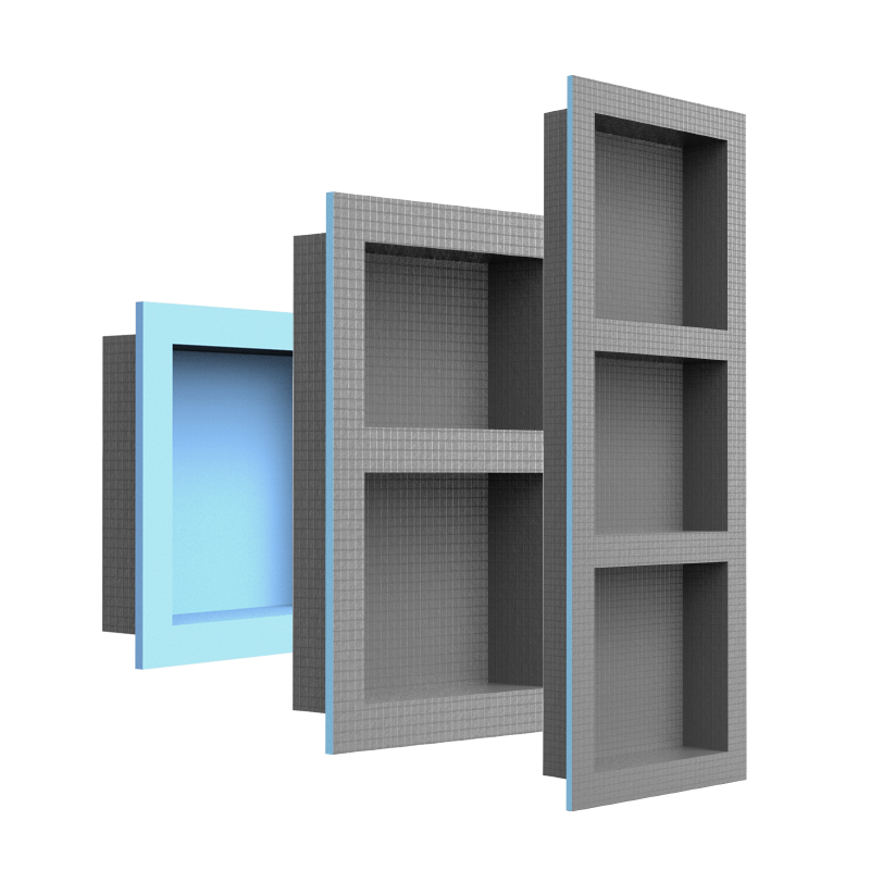 壁龛可作为墙体内部造型的预制件,并与墙体形成一体,尤其适用于潮湿,多水,易发霉的环境,例如卫生间,公共泳池更衣间,建筑地下室等。